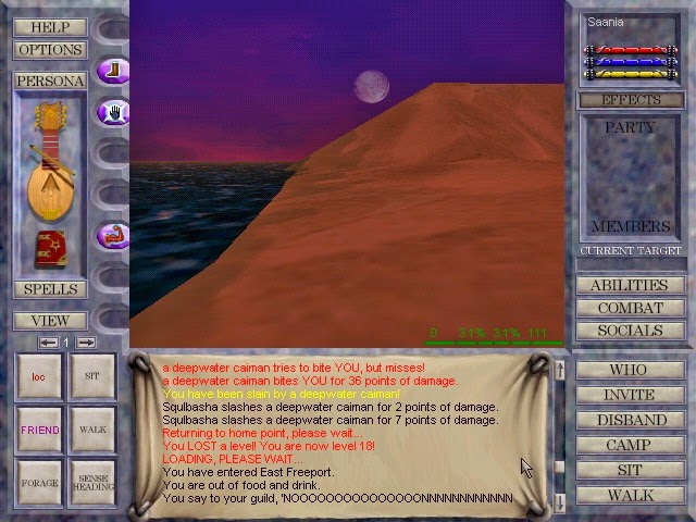 Mourir signifiait être réincarné "à poil" à son "bindpoint" et devoir retourner à pattes chercher son équipement, dans un temps défini sous peine de disparition du corps !! La mort signifiait aussi perdre de l'expérience (eh oui), et on pouvait même perdre des niveaux ! Et laissez-moi vous dire que mourir, ça arrivait beaucoup ...